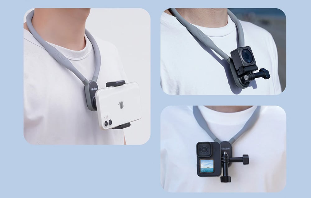 Krční popruh TELESIN je kompatibilní s většinou sportovních kamer, jako jsou GoPro, DJI Osmo Action, Insta360, SJCAM, EKEN, a s dalším adaptérem také s populárními smartphony, včetně iPhone, Samsung, Huawei nebo Xiaomi. Popruh umožňuje natáčení jak na šířku, tak na výšku, což umožňuje zachytit úžasné záběry v různých situacích.